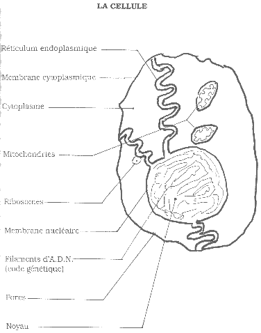 C) Le noyau: Le noyau est la tête dirigeante de ce que va produire le cytoplasme: c’est dans le noyau que se prennent les décisions. Quelles décisions peut prendre un noyau? Il y en a plusieurs: par exemple, il peut décider quand demander au cytoplasme de commencer à synthétiser une hormone quelconque ou encore quand en arrêter la production. Il peut aussi décider quand commencer la multiplication cellulaire et quand l’arrêter. Toutes ces informations sont contenues dans un long filament qui, en fait, est un code. On l’appelle code génétique, car ce code est copié et transmis à chaque multiplication cellulaire et d’une génération à l’autre chez l’être humain. Des extraits de ce code sont copiés et expédiés au cytoplasme en utilisant le réticulum endoplasmique (la tuyauterie interne des cellules) comme voie de communication. C’est un peu comme les mémos qui sont transmis dans une usine par le bureau de direction, et qui diraient par exemple à l’atelier: "Fabriquez des pianos" ou, quand il y en aurait suffisamment, "cessez de fabriquer des pianos". Le noyau est isolé du cytoplasme par une membrane appelée membrane nucléaire. Cette membrane est percée de pores qui sont de petites ouvertures qui permettent l’échange d’informations entre le noyau et le cytoplasme. Toutes les cellules de l’organisme humain possèdent un noyau, sauf les globules rouges et les plaquettes du système sanguin.